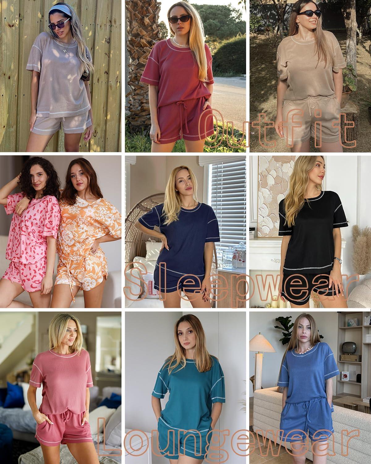 Ekouaer Women’s Waffle Knit Two Piece Lounge Set, Soft Matching Outfits for Daily Wear, Casual Shorts Set with Pocket(Date Red)