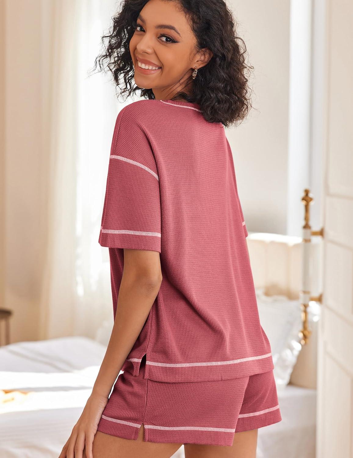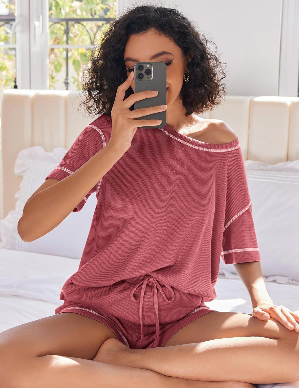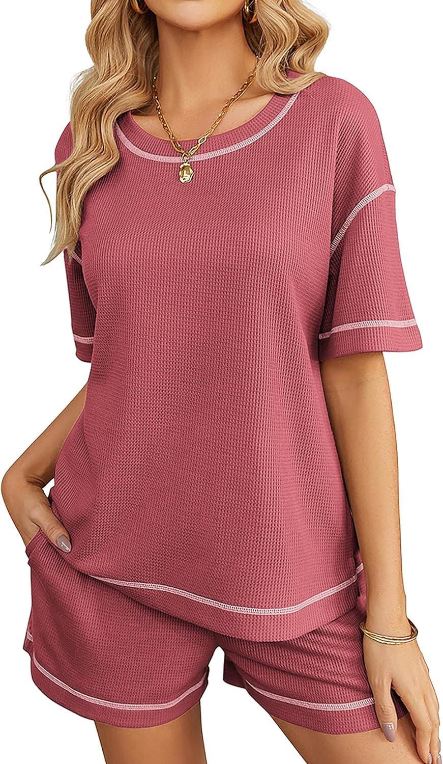 Ekouaer Women's Waffle Knit Two Piece Lounge Set, Soft Matching Outfits for Daily Wear, Casual Shorts Set with Pocket(Gray Purple Red)