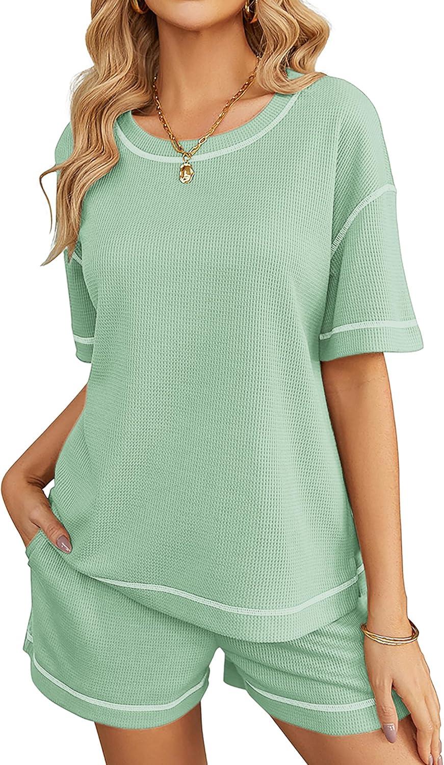Ekouaer Women's Waffle Knit Two Piece Lounge Set, Soft Matching Outfits for Daily Wear, Casual Shorts Set with Pocket(Ice Green)