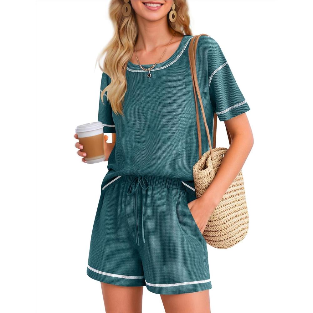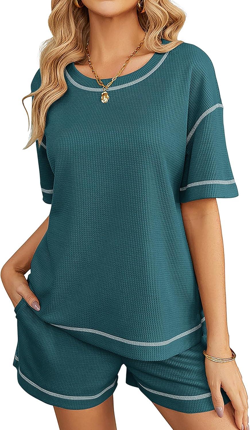 Ekouaer Women's Waffle Knit Two Piece Lounge Set, Soft Matching Outfits for Daily Wear, Casual Shorts Set with Pocket(Peacock Blue)