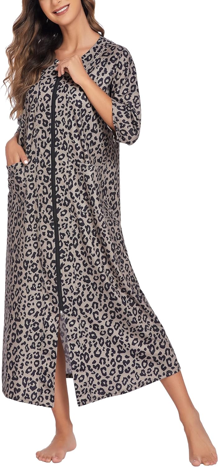 Ekouaer Women’s Zipper Robe 3/4 Sleeve Housecoats Full Length House Dress Loungewear Long Nightgown with Pockets(Leopard)