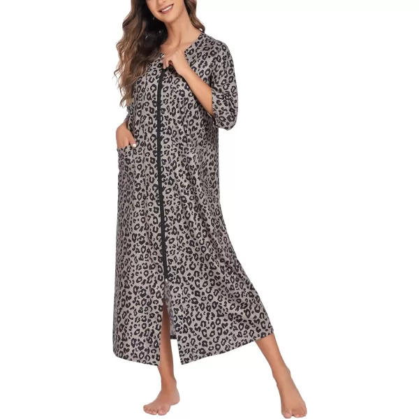 Ekouaer Womens Zipper Robe 34 Sleeve Housecoats Full Length House Dress Loungewear Long Nightgown with PocketsLeopard