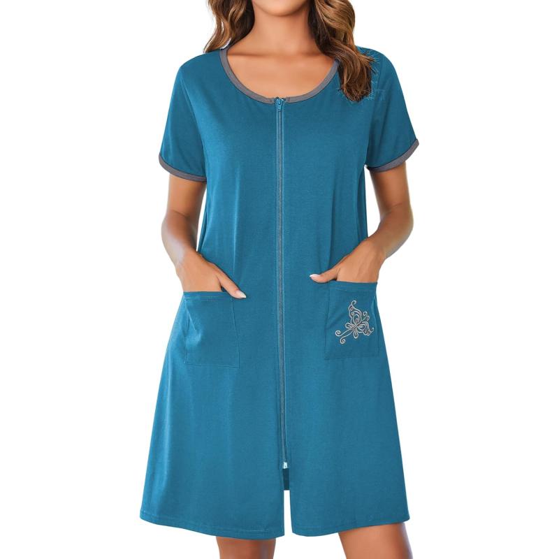 Ekouaer Zip Up Robes for Women Short Sleeves Zipper House Coat Short Bathrobes Lightweight Nightgown with Pockets S-3XL(Peacock Blue)