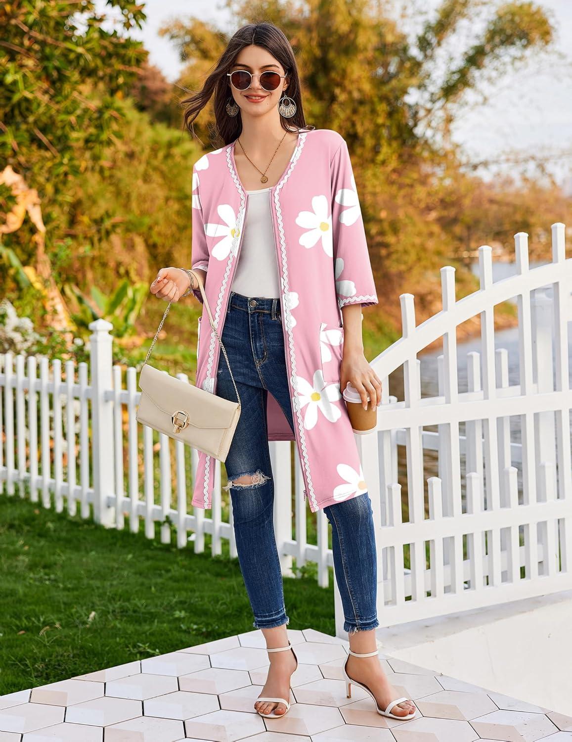 Ekouaer Zipper Robes for Women 3/4 Sleeves Lightweight House Coat Zip Up Bathrobe Soft Nightgown with Pockets S-3XL(Pink Floral)
