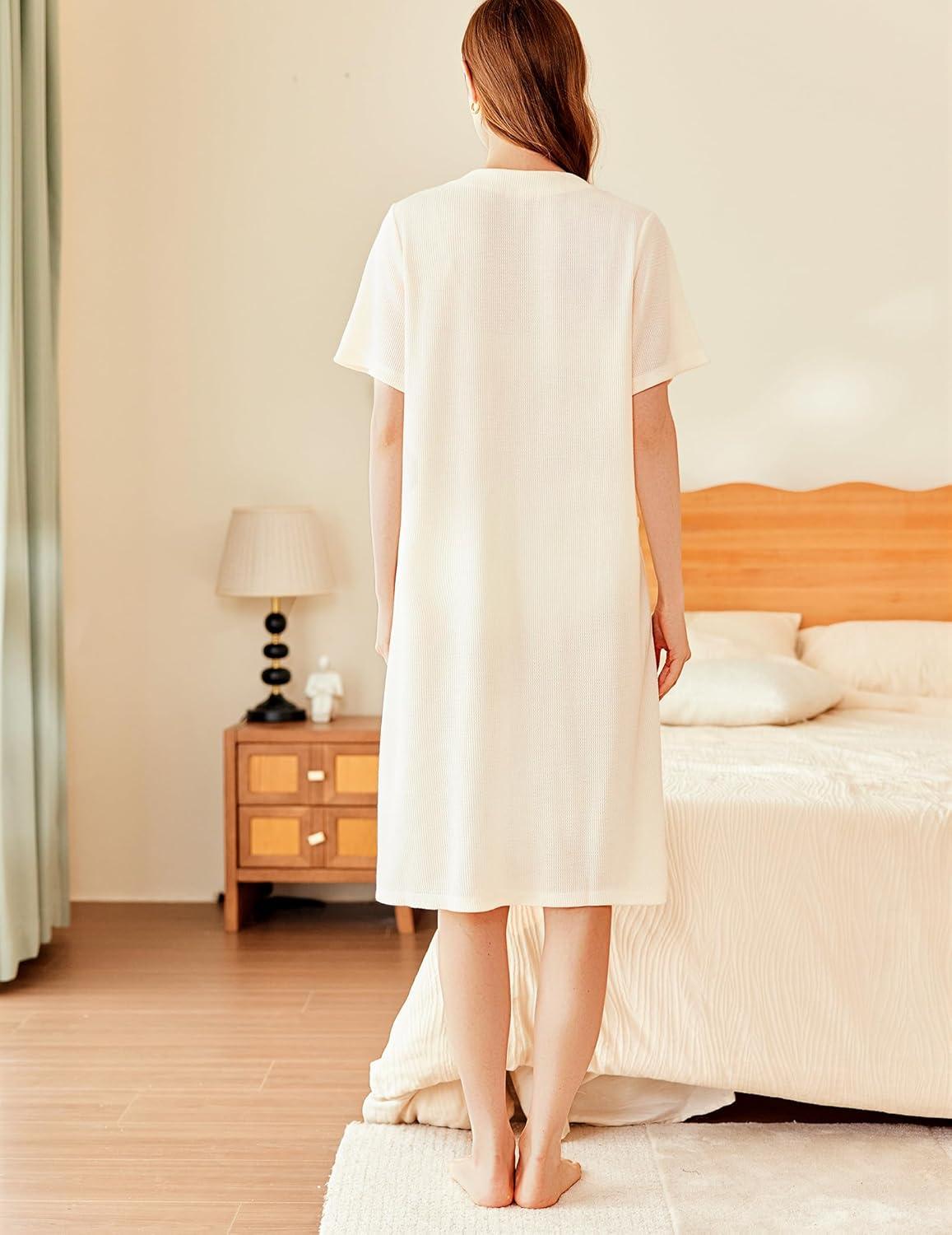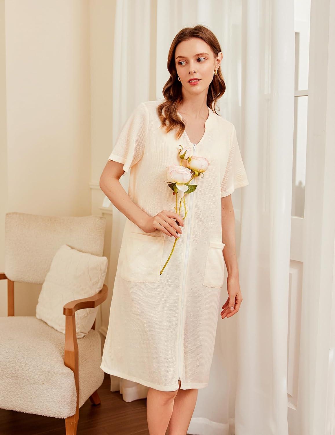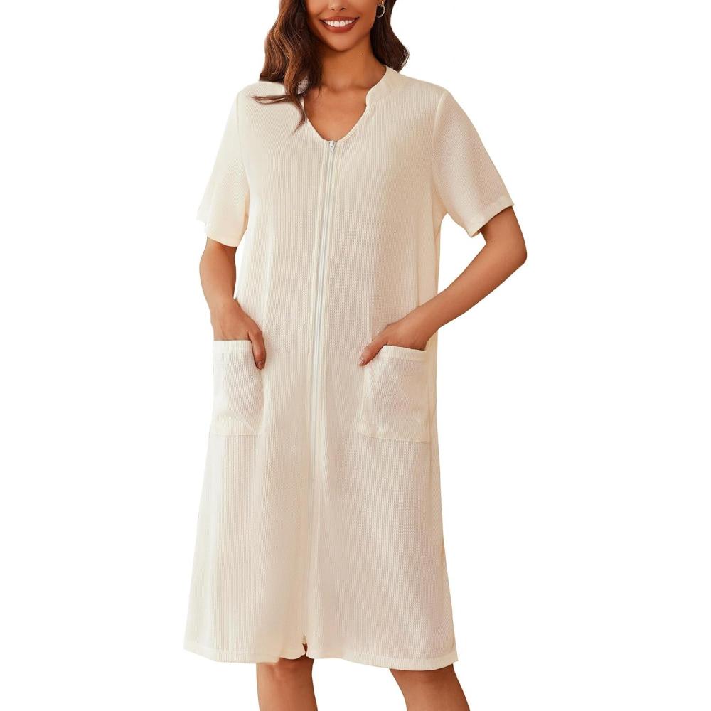 Ekouaer Zipper Robes for Women Waffle Knit Bathrobes Short Lightweight Knee Length Loungewear with Pockets S-XXL(A-beige)