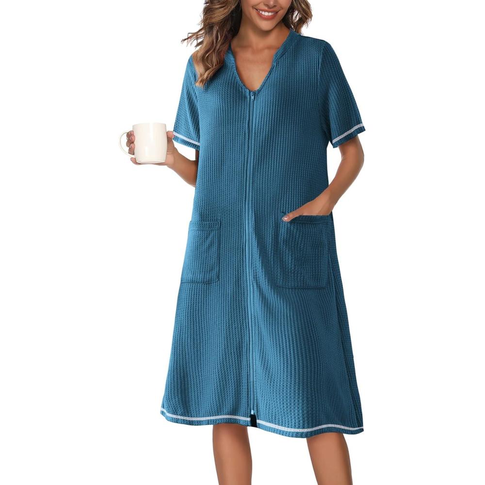 Ekouaer Zipper Robes for Women Waffle Knit Bathrobes Short Lightweight Knee Length Loungewear with Pockets S-XXL(A-snorkel Blue)