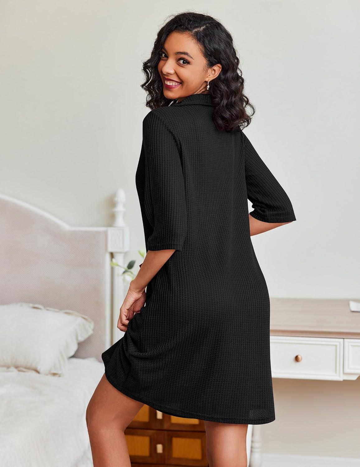 Ekouaer Zipper Robes for Women Waffle Knit Bathrobes Short Lightweight Knee Length Loungewear with Pockets S-XXL(Black)