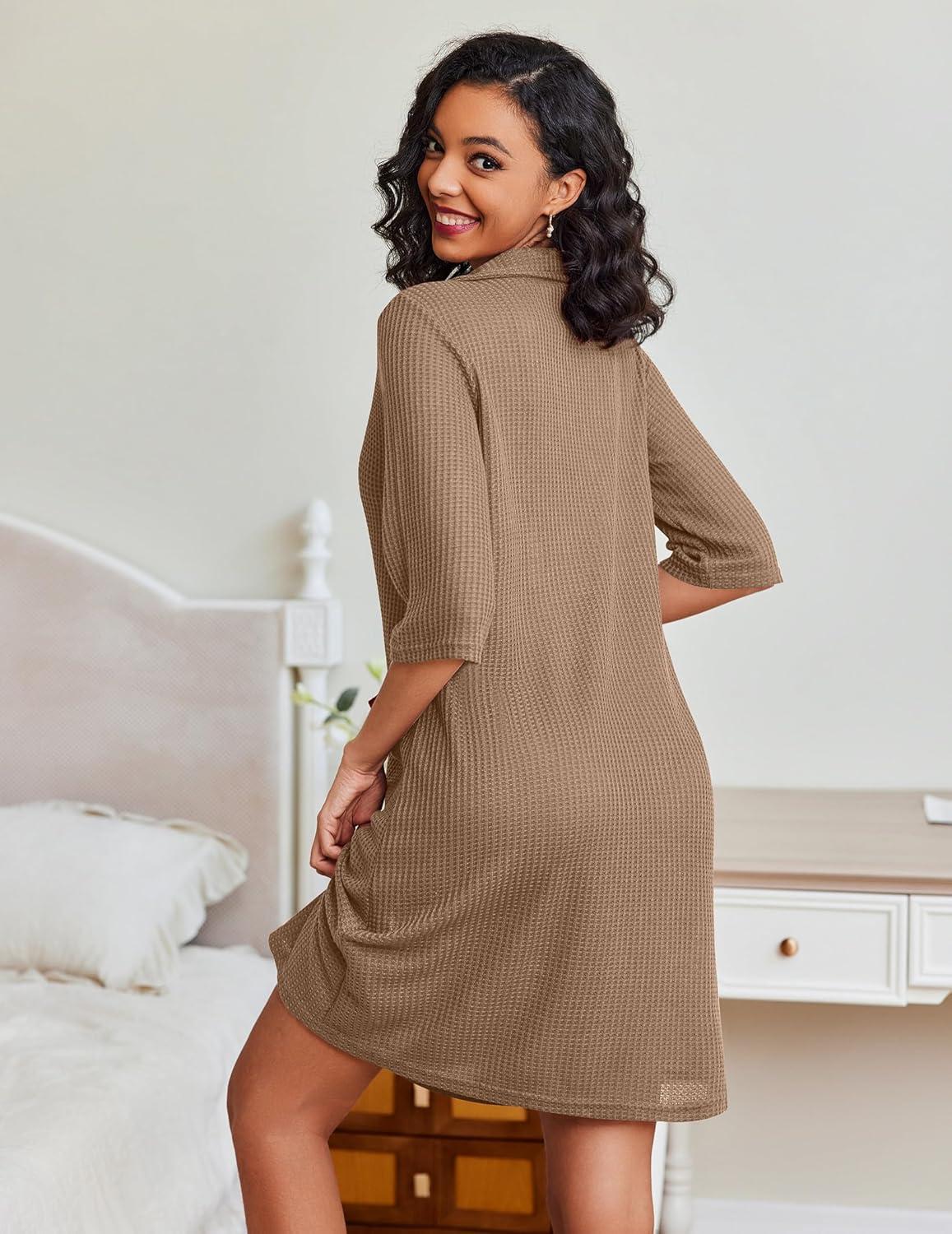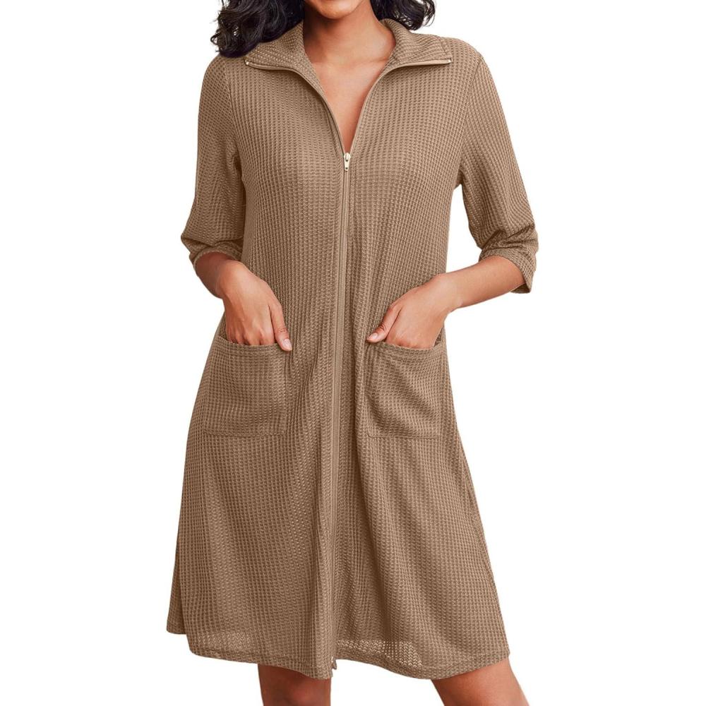 Ekouaer Zipper Robes for Women Waffle Knit Bathrobes Short Lightweight Knee Length Loungewear with Pockets S-XXL(Khaki)