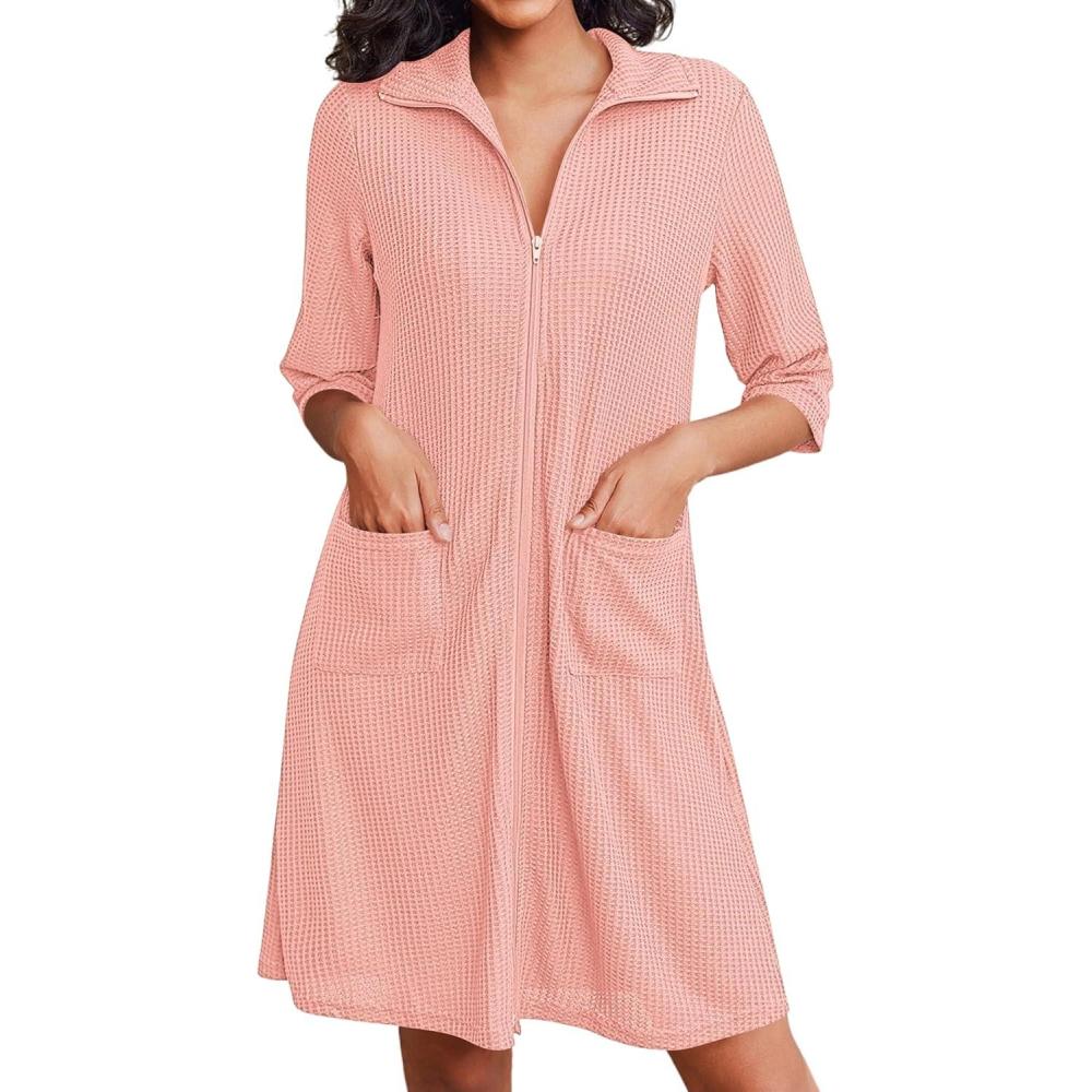 Ekouaer Zipper Robes for Women Waffle Knit Bathrobes Short Lightweight Knee Length Loungewear with Pockets S-XXL(Misty Rose)