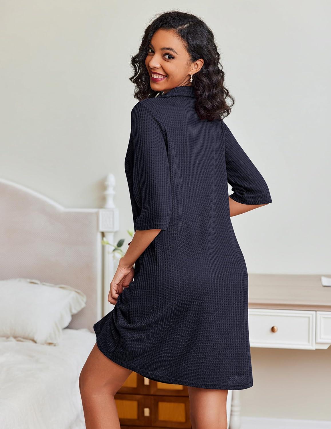 Ekouaer Zipper Robes for Women Waffle Knit Bathrobes Short Lightweight Knee Length Loungewear with Pockets S-XXL(Navy Blue)